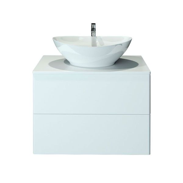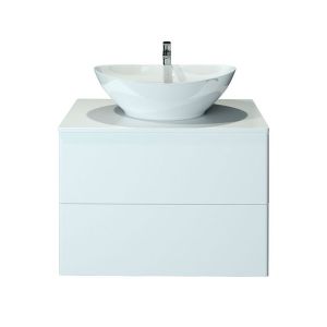 Подвесная тумба с раковиной-чашей и столешницей МДФ, с двумя выдвижными ящиками. Предназначена для использования в ванных комнатах с повышенной влажностью. Система Push to Open: ящики открываются нажатием на них. Высокое качество сборки, материалов и фурнитуры. Столешница, корпус и фасад: МДФ, плёнка ПВХ белая глянцевая. Раковина накладная (глубина 10 см) - фаянс.