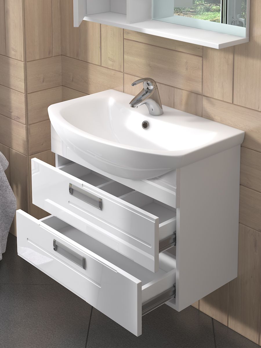 Размер: 715х450х560см (вместе с умывальником)2 выдвижных ящика; ручка врезная металлическая.Материал корпуса: влагостойкая ЛДСП