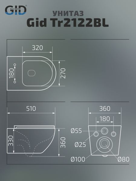 Convexo — коллекция округлых унитазов и биде, идеально подходящих для современных интерьеров. Испанское качество и соответствие европейским нормам — основные черты серии. Подвесной безободковый унитаз GiD Tr2122BL - модель с горизонтальным выпуском выполнена из мелкопористой керамики в черном глянцевом цвете. Оснащена быстросъёмным сиденьем из дюропласта с функцией микролифта, обеспечивающей плавное и бесшумное опускание крышки. Благодаря антигрязевому покрытию и воронкообразной овальной чаше унитаз обеспечивает высокий уровень гигиены и легкость ухода. Комплект: подвесной унитаз GiD Tr2122BL с креплениями для скрытого монтажа; сиденье с креплениями.