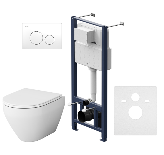 Полностью готовый к установке комплект: система инсталляции с клавишей, подвесной унитаз сиденьем.Не разборная рама из стального профиля выдерживает нагрузку до