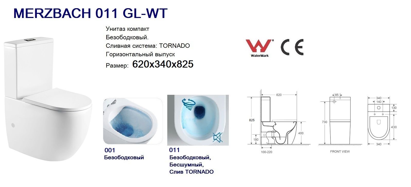 Унитаз WeltWasser WW MERZBACH 011 GL-WT белыйТехнология слива TORNADO* Бесшумный* Горизонтальный выпуск* Двойная кнопка слива 3/6 л* Сиденье: тонкое, быстросъёмное, дюропласт с микролифтом* Нижний подвод воды* Антибактериальное покрытие (технология PureGuard) препятствует размножению бактерий* Особая глазурь для легкой очистки отталкивает известковые отложения и загрязнения* Цвет: белый глянцевый.