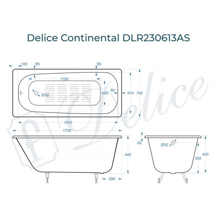 Ванна чугунная Delice Continental DLR230613-AS 170x70 с антискользящим покрытием купить