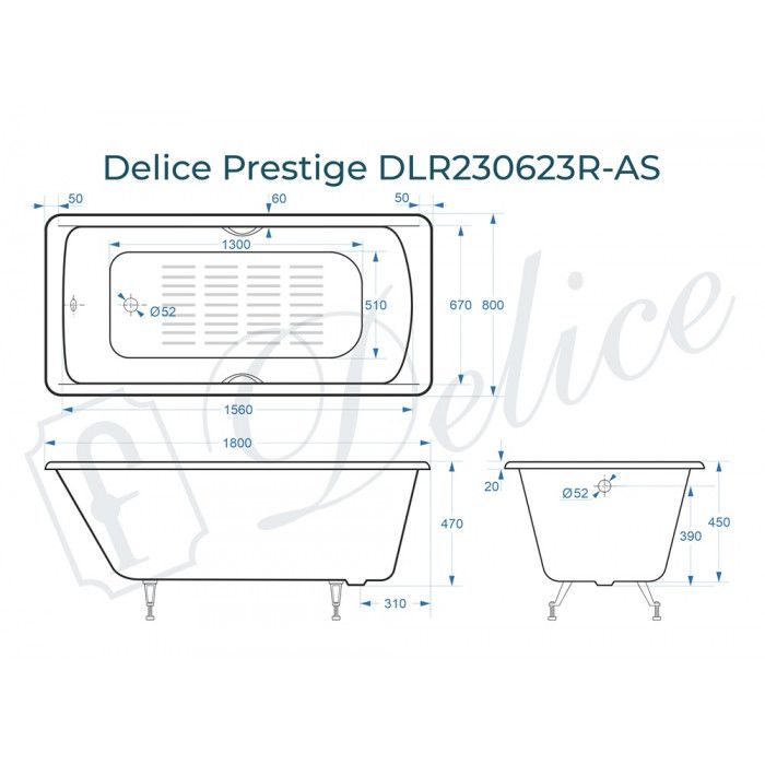 Ванна чугунная Delice Prestige DLR230623R-AS 180х80 с отверстиями под ручки и антискользящим покрытием купить