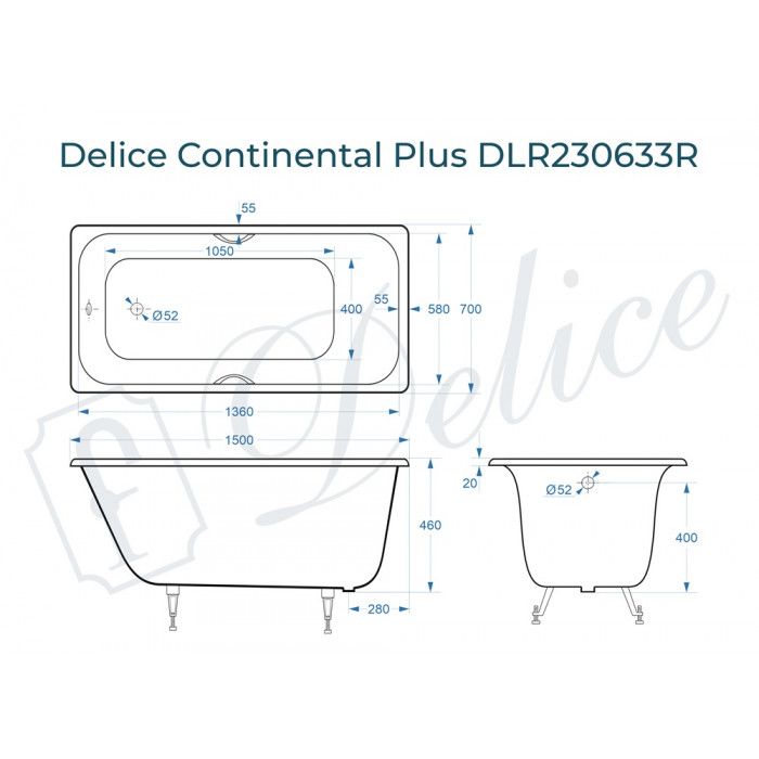 Ванна чугунная Delice Continental PLUS DLR230633R с отверстиями под ручки 150х70 см