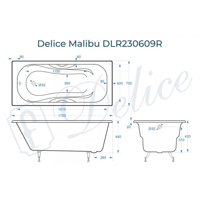 Ванна чугунная Delice Malibu DLR230609R 170x75 с отверстиями под ручки купить