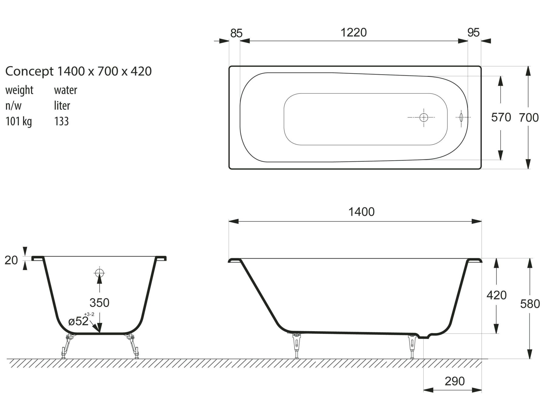 Общие характеристикиРазмер 140х70Длина 140 смШирина 70 смГлубина 42 смВысота на ножках 57 смПолезный объём 188 лВес 101 кгБренд Vinsent Veron7 слёв титановой эмали класса 1АЦвет эмали белыйБез антискользящего покрытияДиаметр слива Ø52Расположение перелива стандартное