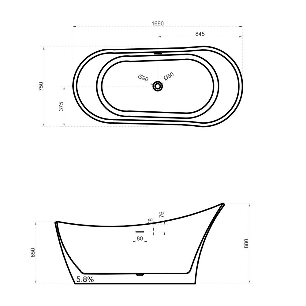 Ванна из искусственного камня ABBER Stein AS9618 169x75см белый матовый