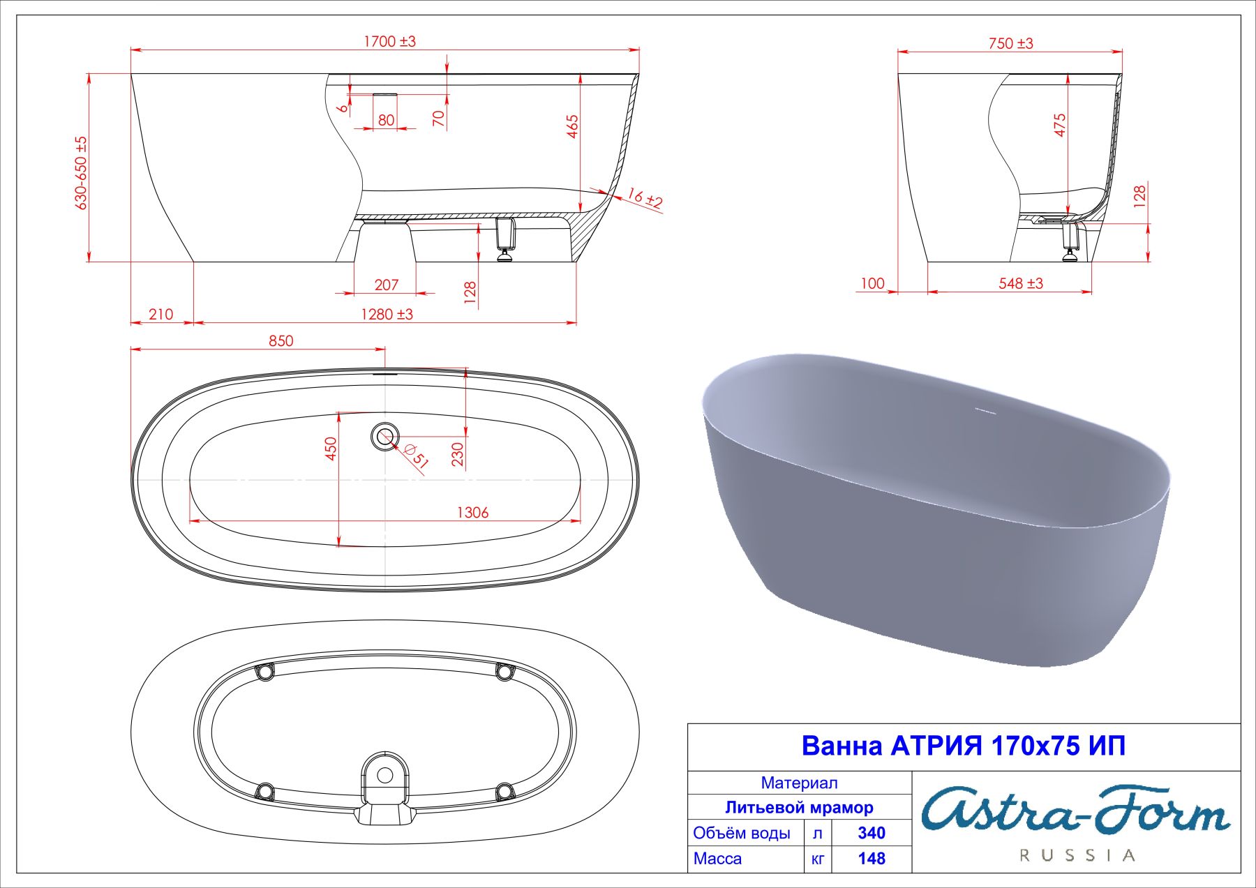 Ванна из искусственного камня Astra-Form Атрия 01010092 170x75 см белый матовый