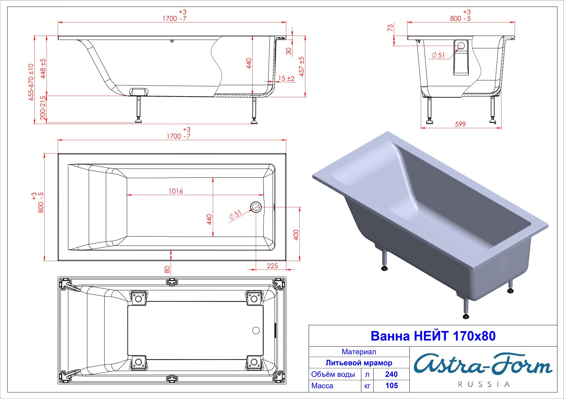 Ванна из искусственного камня Astra-Form Нейт 01010033 170x80 см белый глянец купить