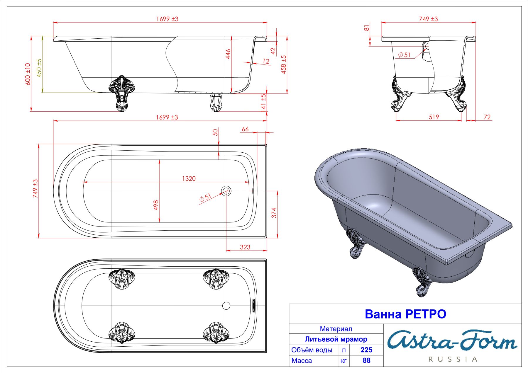 Ванна из искусственного камня Astra-Form Ретро 01010006 170x75 см белый глянец купить