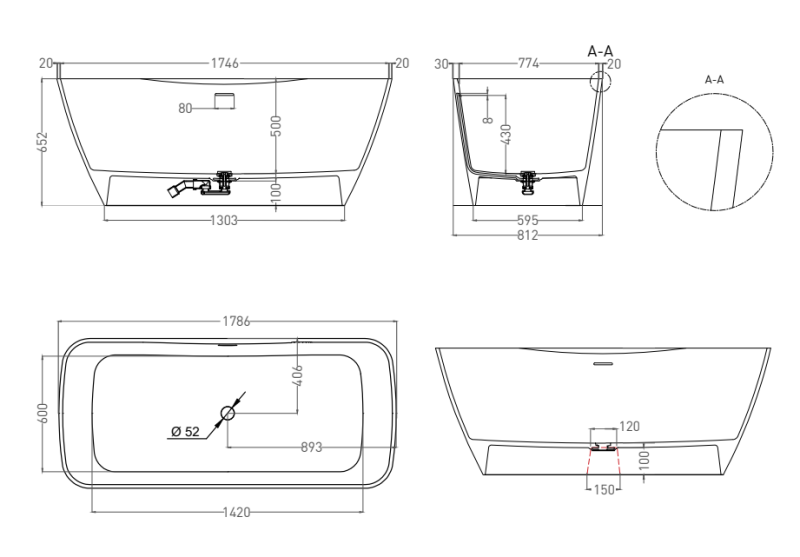 Ванна из искусственного камня Salini Agatha S-Stone 100221MRH 180x80см RAL снаружи
