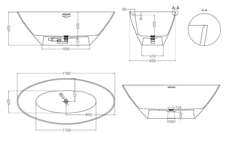 Ванна из искусственного камня Salini Diva S-Stone 102221MRH 178x85см RAL снаружи