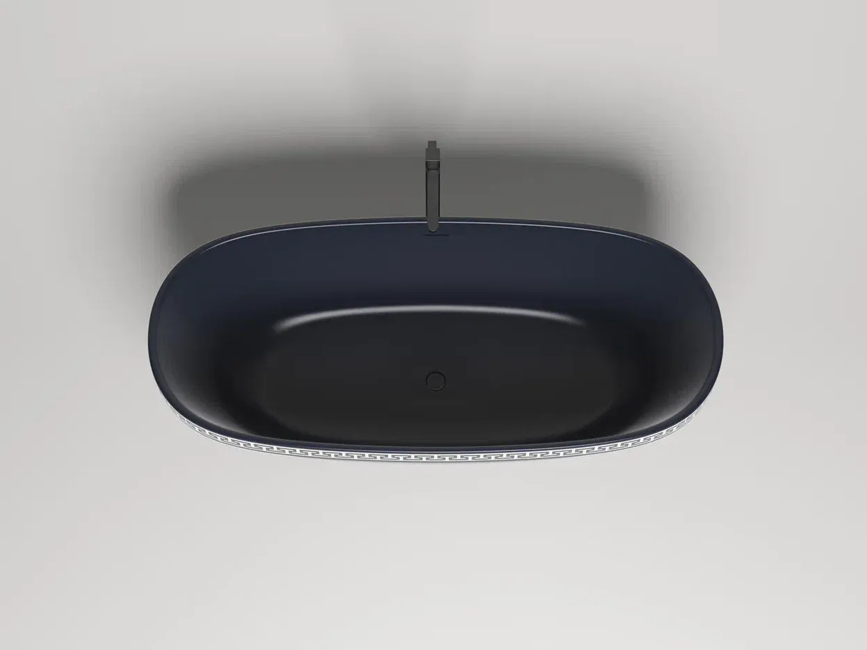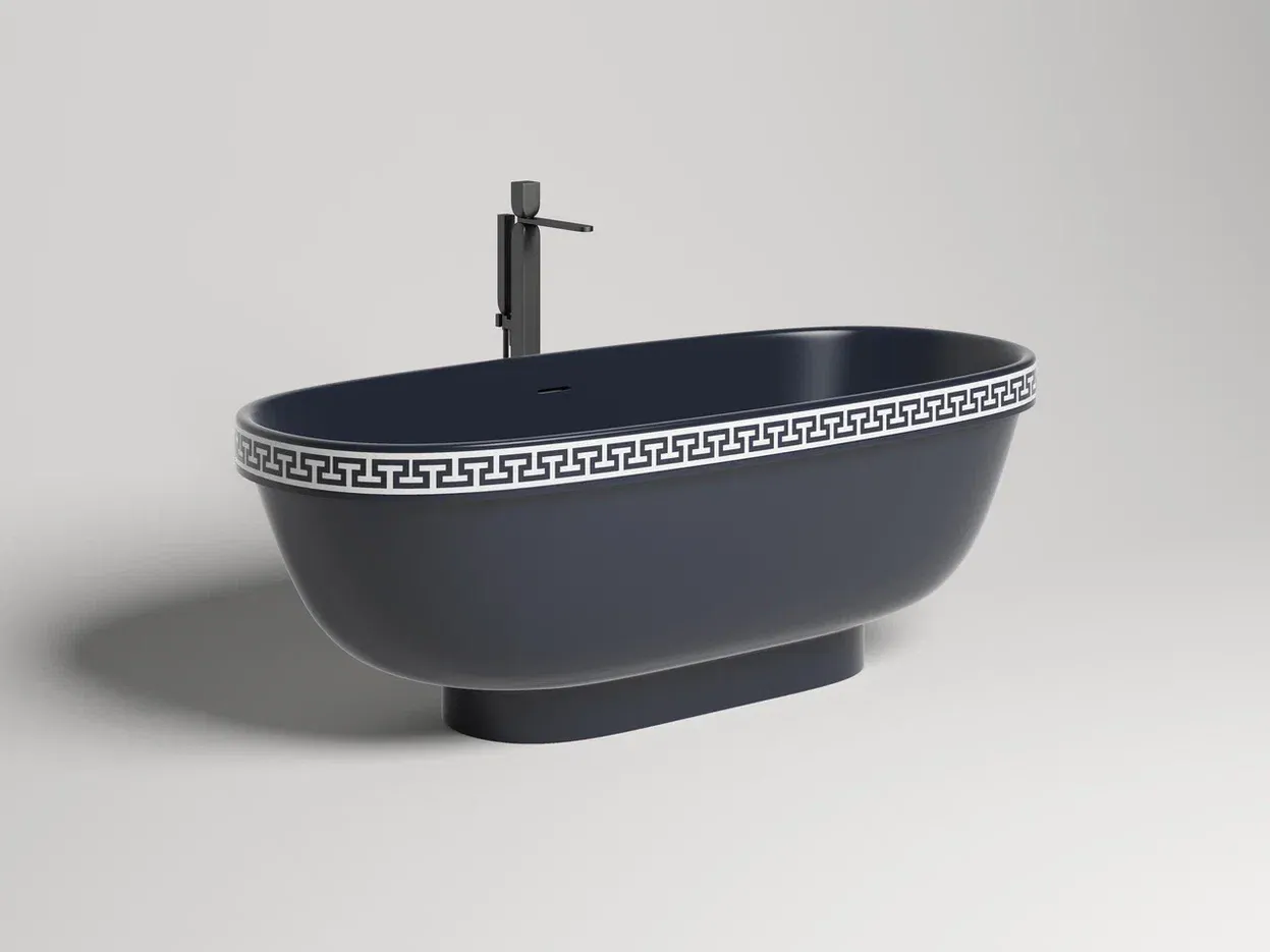 Ванна предлагается в двух версиях — с гладким бортом и бортом, украшенным классическим древнегреческим орнаментом. Полоса орнамента «меандр» из материала S-Shine на основе эпоксидной смолы интегрирована в борт ванны, она прокрашивается в глубину любым цветом палитры RAL Classic. Такой орнамент не сотрётся со временем и никогда не выйдет из моды, как и сама модель классических пропорций.
