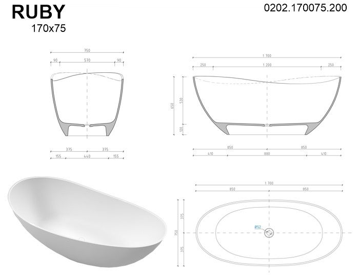 Ванна из искусственного камня Whitecross Ruby 0202.170075.200 170x75см белый матовый купить