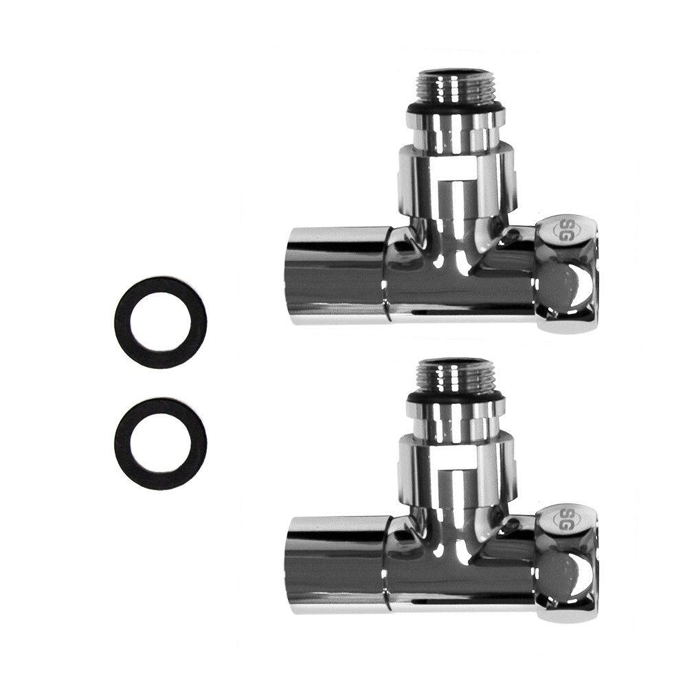 Вентили запорные угловые (запорно-регулировочная арматура) применяются для регулирования количества подачи горячей воды в водяной полотенцесушитель типа лесенка при обязательном наличии байпаса.Регулировка подачи воды в полотенцесушитель приводит к увеличению или уменьшению температуры нагрева полотенцесушителя либо к полному перекрытию поступления теплоносителя (воды) в полотенцесушитель.Наличие кранов значительно повышает функциональность полотенцесушителя типа лесенка — регулируется температура полотенцесушителя, перекрывается подача воды, проходящей через полотенцесушитель, без необходимости отключения стояка, что особенно актуально при демонтаже полотенцесушителя.Краны устанавливаются на места соединительных угловых блоков полотенцесушителя, при горизонтальном подключении – в одной плоскости, при диагональном подключении – снизу и сверху.Подключение к полотенцесушителю осуществляется при помощи наружной резьбы 1/2'', к системе отопления при помощи накидной гайки с внутренней резьбой 3/4''.Краны не только влияют на функциональность полотенцесушителя, но и придают прибору более завершенный эстетичный внешний вид.Комплектация вентилей: