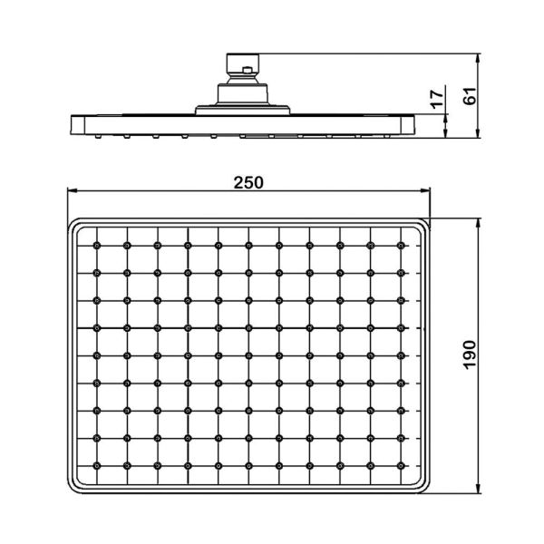 Верхняя душевая насадка Хромированная лицевая поверхность.Система Air-In.Латунный шарнирный крепеж. Размер - 250х190 мм.