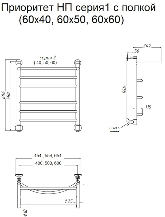 Водяной полотенцесушитель Тругор Приоритет НП 1 П с полкой 60x50см хром Приоритет1/нп6050П