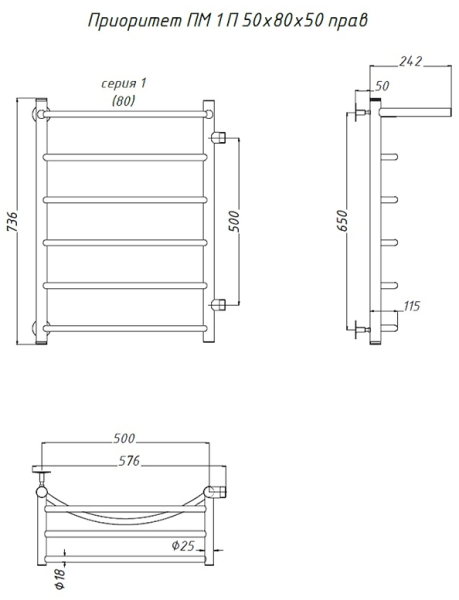 Водяной полотенцесушитель Тругор Приоритет ПМ 1 50x80x50см с полкой правый хром Приоритет1/ПМ508050Ппра