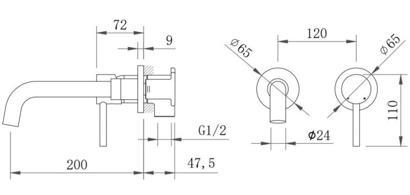 Раздельный смеситель из стены, с удобной поворотной ручкой для регулировки температуры выходящей воды. Выполнен в современном стиле, а так же макси.