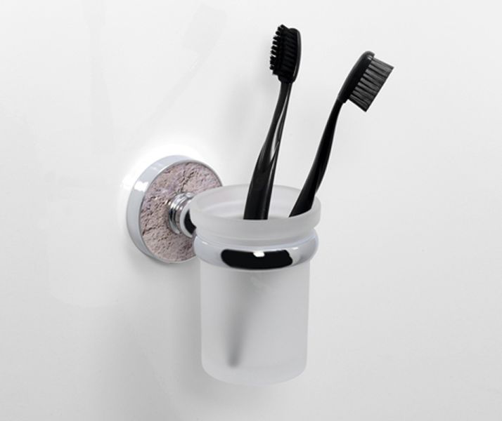 WasserKRAFT Стакан для щеток с держателем K-7728Размер: Ш70 х Г111 х В100 ммМонтаж: настенныйЦвет держателя: хром, акриловая вставка "декоративный травертин"Стакан: матовое стеклоМатериалы: металл, акрил, хромоникелевое покрытие, уплотнительные пластиковые кольца, матовое стекло