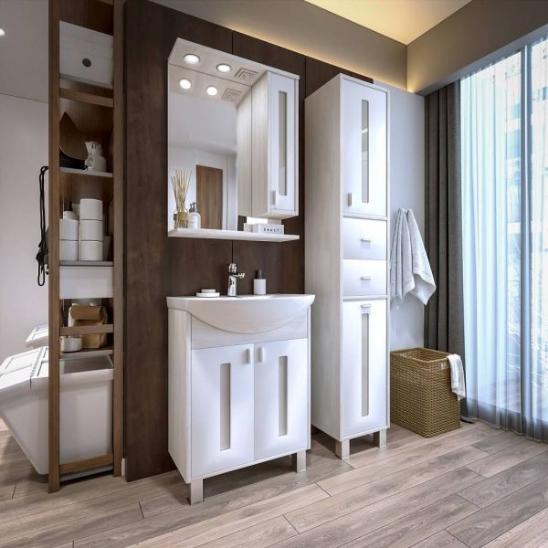 Внутреннее содержание шкафа умело организовано: разнообразные полки и отсеки позволяют удобно разместить все необходимые аксессуары – от косметики до бытовой химии. Зеркало, интегрированное в фасад, визуально расширяет пространство и облегчает утренние рутинные процедуры.