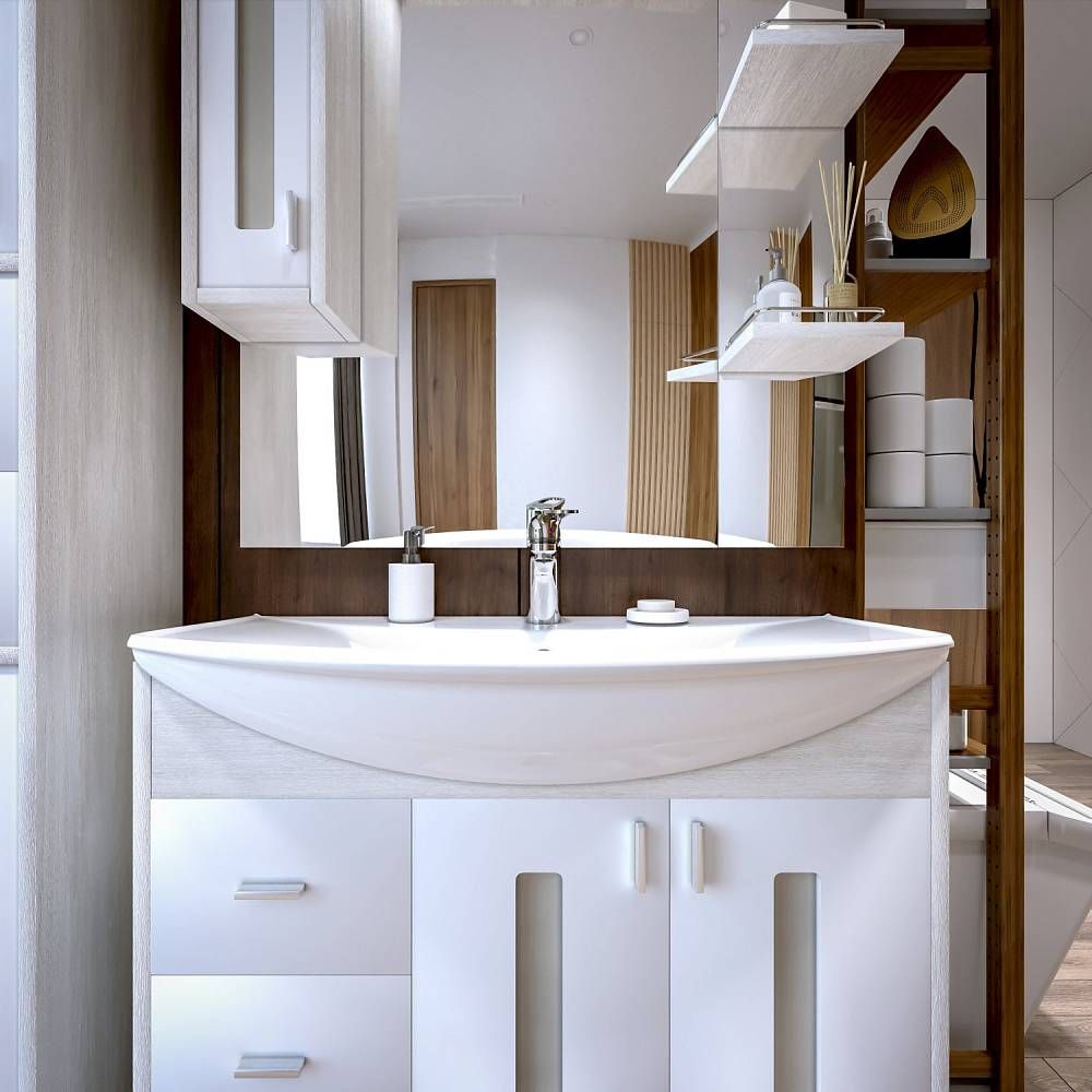Внутреннее содержание шкафа умело организовано: разнообразные полки и отсеки позволяют удобно разместить все необходимые аксессуары – от косметики до бытовой химии. Зеркало, интегрированное в фасад, визуально расширяет пространство и облегчает утренние рутинные процедуры.
