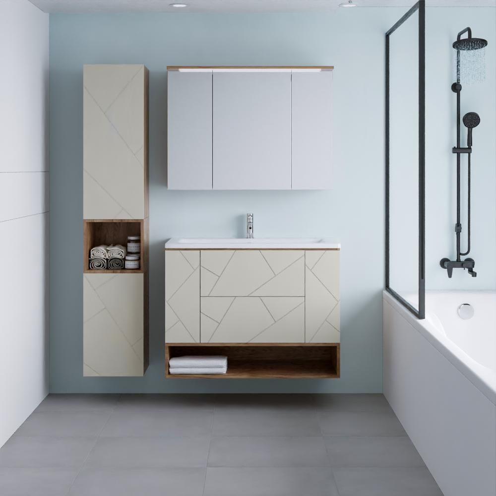 Внутреннее содержание шкафа умело организовано: разнообразные полки и отсеки позволяют удобно разместить все необходимые аксессуары – от косметики до бытовой химии. Зеркало, интегрированное в фасад, визуально расширяет пространство и облегчает утренние рутинные процедуры.