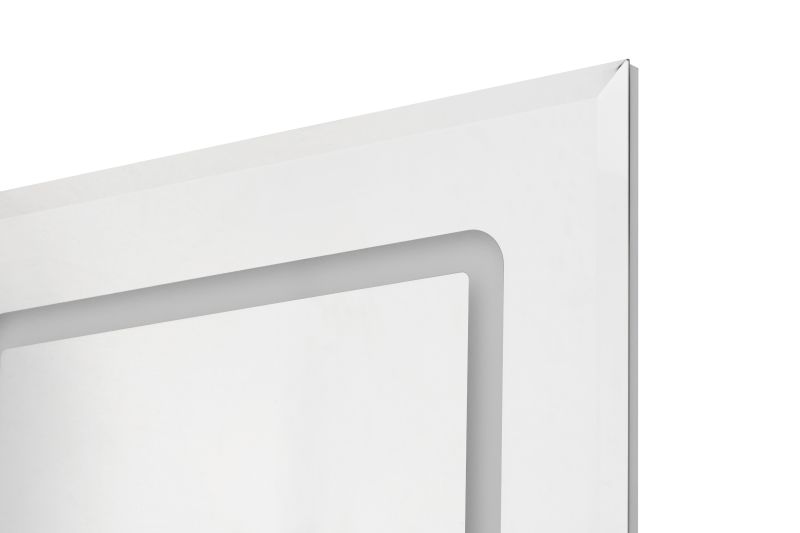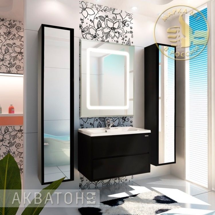 - В зеркале за гравировкой установлена подсветка, которая легко включается при помощи сенсорного выключателя