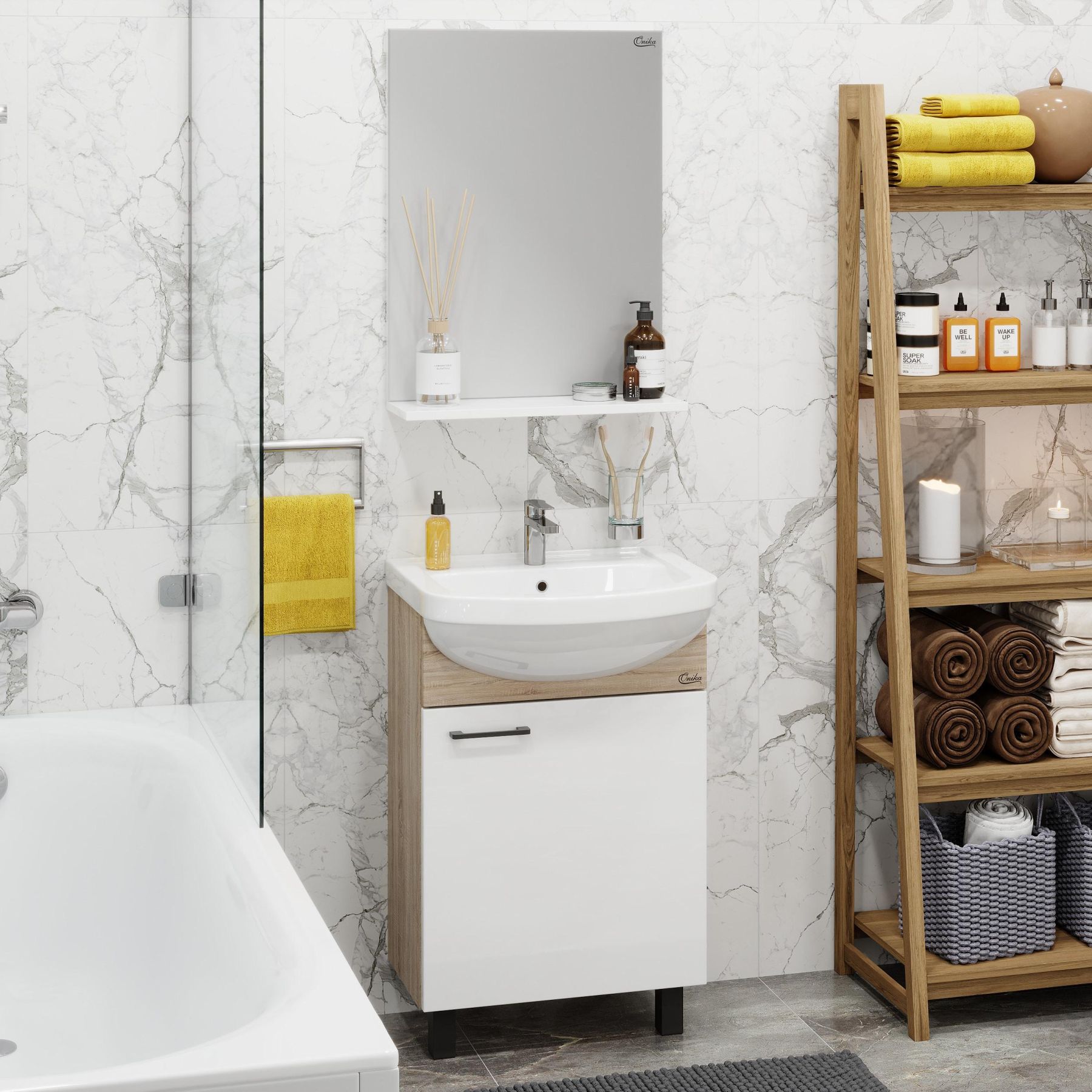 Зеркало выполнено из ЛДСП, устойчивой к механическим воздействиям, перепадам температур и высокой влажности.
