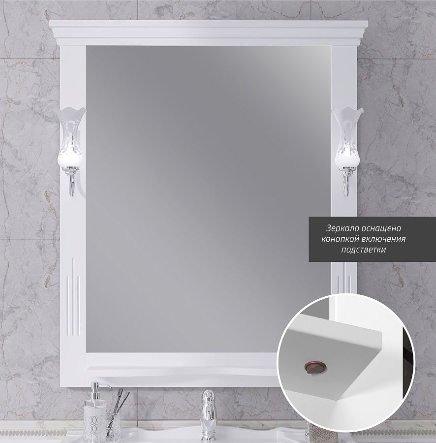 Светильники приобретаюся отдельно.Зеркала по умолчанию идут с отверстиями под светильники. В случае отсутствия необходимости заказа светильников, возможна комплектация зеркала декоративными накладками серебро или бронза.Коллекция Риспекто символизирует лучшие традиции неоклассики в сочетании с необыкновенной функциональностью и простотой дизайна.Строгий контроль при изготовлении изделий исключает наличие малейших дефектов. Зеркальное полотно дает четкое отражение без каких-либо искажений. Слоновая кость цвет прекрасно дополнит интерьер ванной комнаты.
