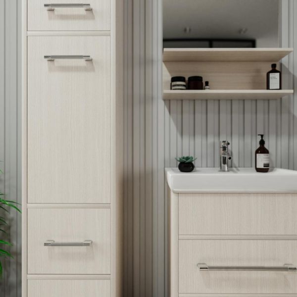 Его чистые линии и сдержанная форма создают гармоничный контраст с отделкой стен и сантехникой, добавляя комнате ощущение простоты и элегантности.