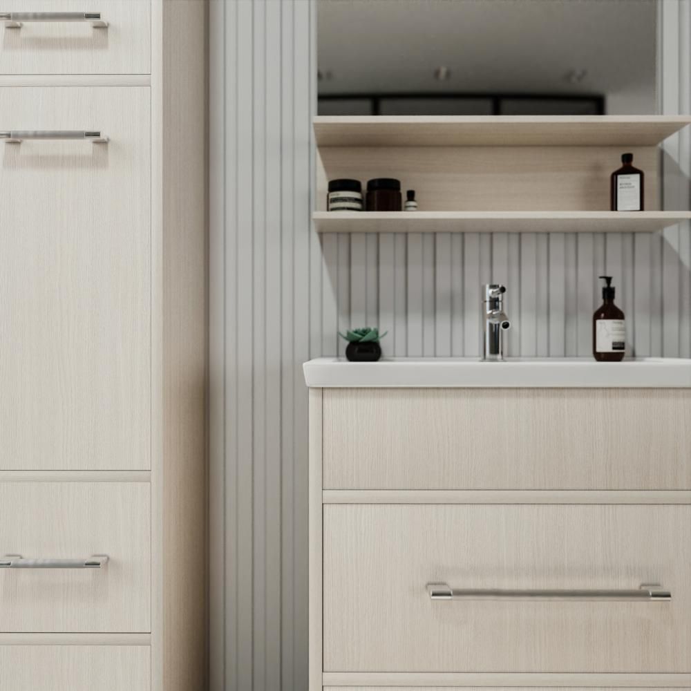 Его чистые линии и сдержанная форма создают гармоничный контраст с отделкой стен и сантехникой, добавляя комнате ощущение простоты и элегантности.