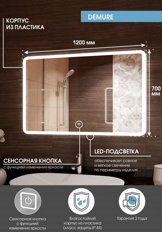 Зеркало "Demure Led" 1200х700LED подсветка 6000Ксенсорный выключатель с функцией димирования