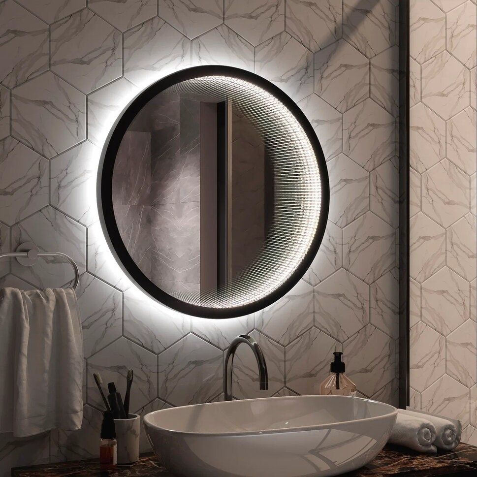 Зеркало "Infiniti Black Led" D 600 с датчиком движенияLED подсветка 6000Кдатчик движения на корпусеэффект тоннеля