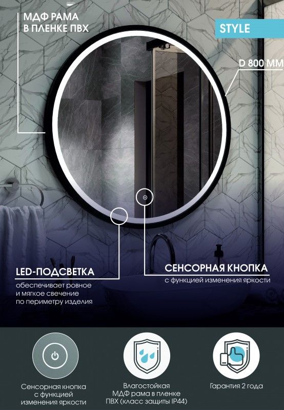 Зеркало "Style Black Led" D 800LED подсветка 6000Ксенсорный выключатель с функцией димированияМДФ короб черного цвета