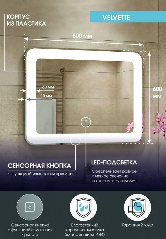 Зеркало "Velvette Led" 800x600LED подсветка 6000Ксенсорный выключатель с функцией димирования