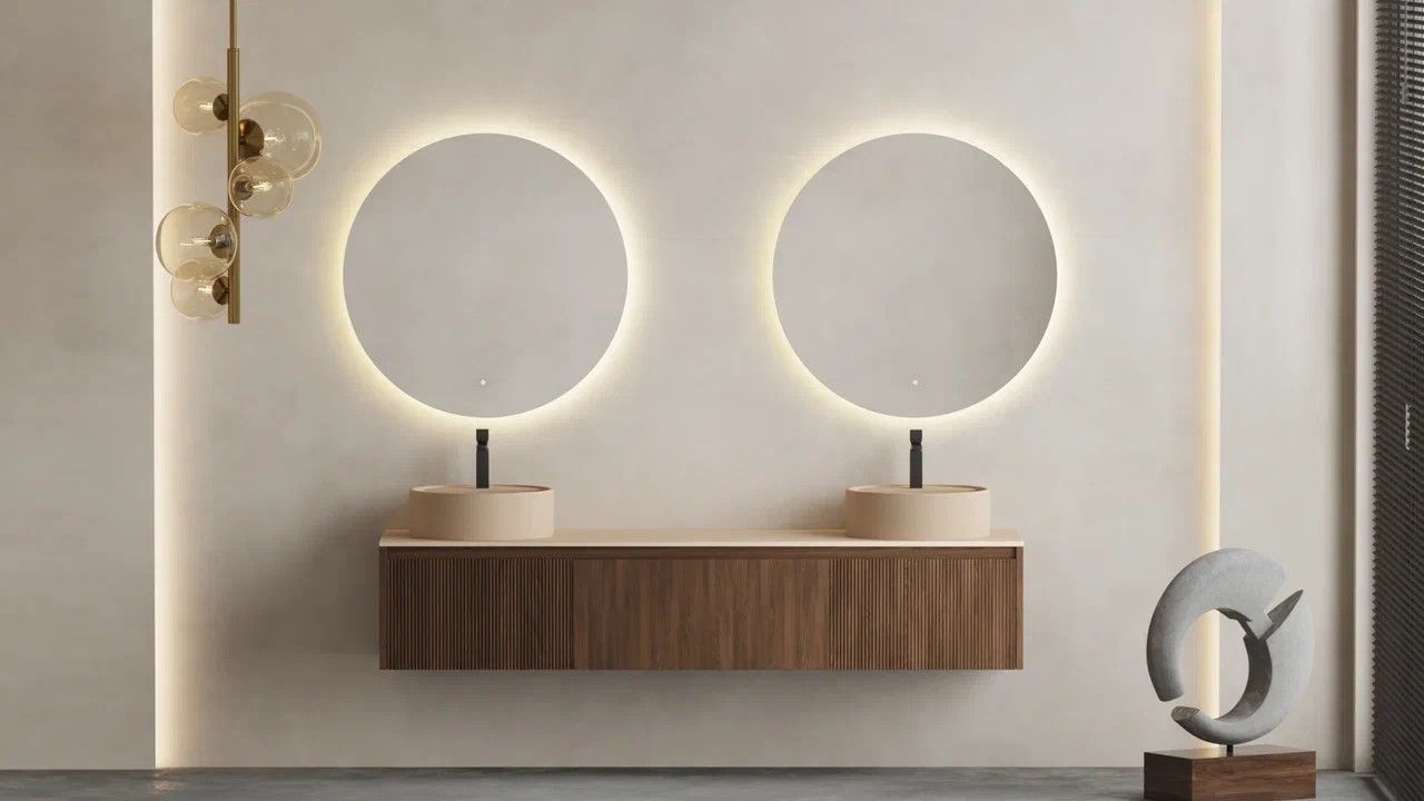 Идеальные линии, шлифовка «Еврокромка», фоновая LED-подсветка по всему периметру, управляемая одним касанием, эффект парящего зеркала благодаря тонкому корпусу в 20 мм, смещённому от края на 15 мм – коллекция OMBRA создана для тех, кто выбирает продуманный, стильный и комфортный интерьер ванной комнаты.