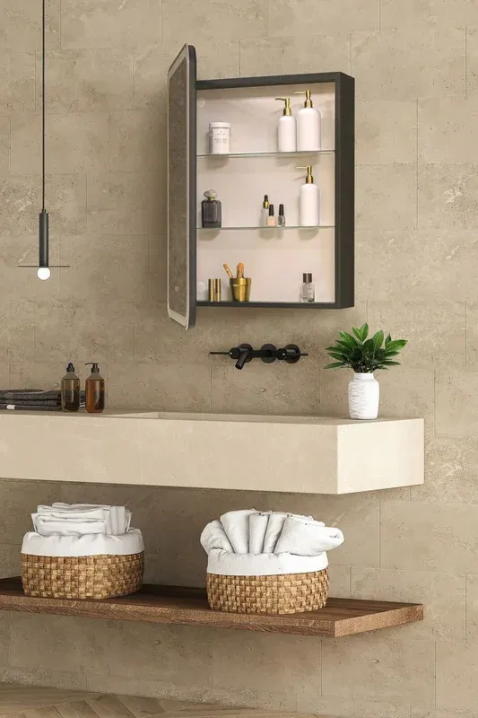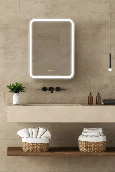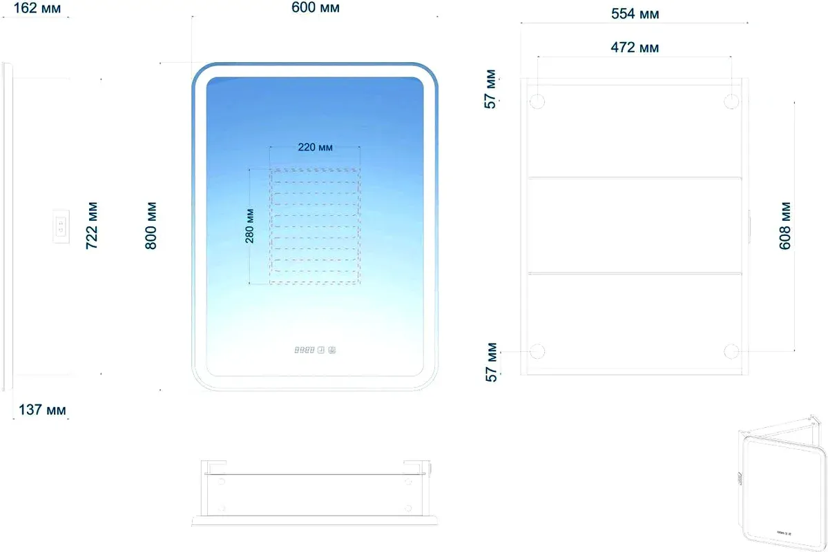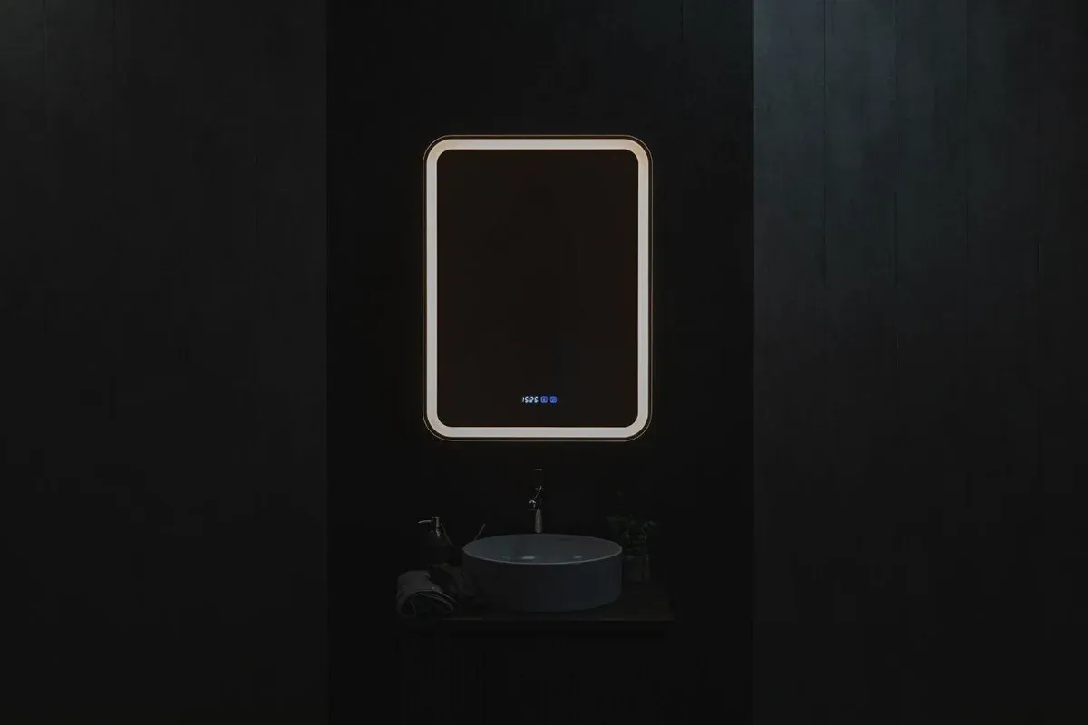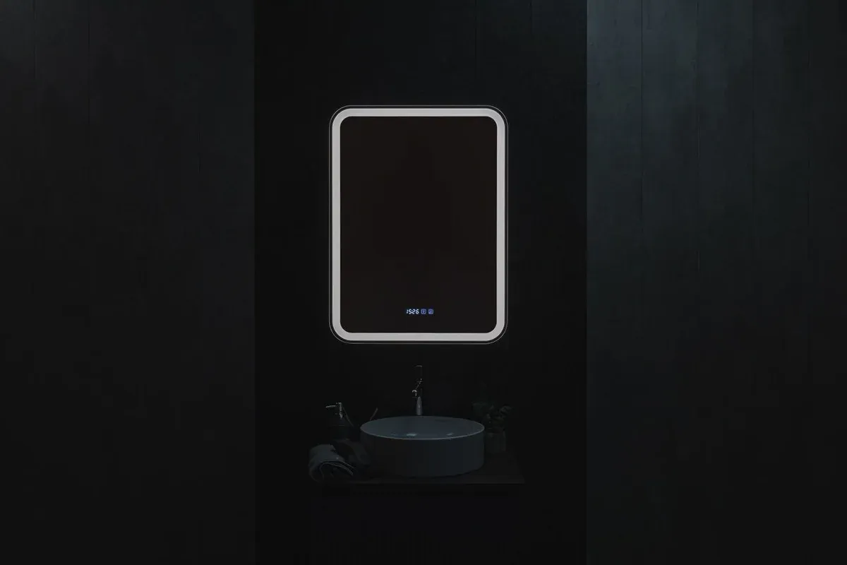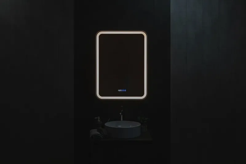 Зеркало-шкаф, оснащенное светодиодной LED подсветкой с диммером, часами и функцией антизапотевания