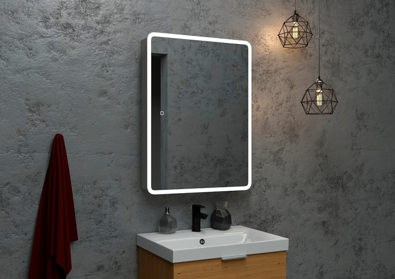 Зеркало-шкаф "Emotion LED" 600х800LED подсветка 6000К; сенсорное включение справа по центру, реверсивные крепления, пластиковый короб, прямые углы на коробе и радиусные на зеркале, полка/2 шт, без розетки, петли Firmax
