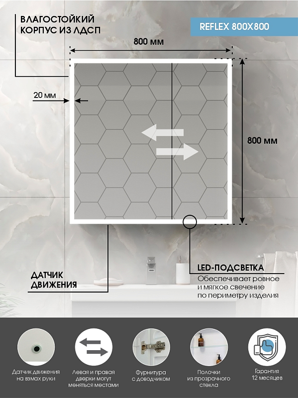 Зеркало-шкаф "Reflex LED" 800х800 с датчиком движенияLED подсветка 6000К; ДД, пластиковый короб, прямые углы на коробе и зеркале, полка/2 шт, без розетки, пескоструйная полоса без отступа, 2 створки (300х500)